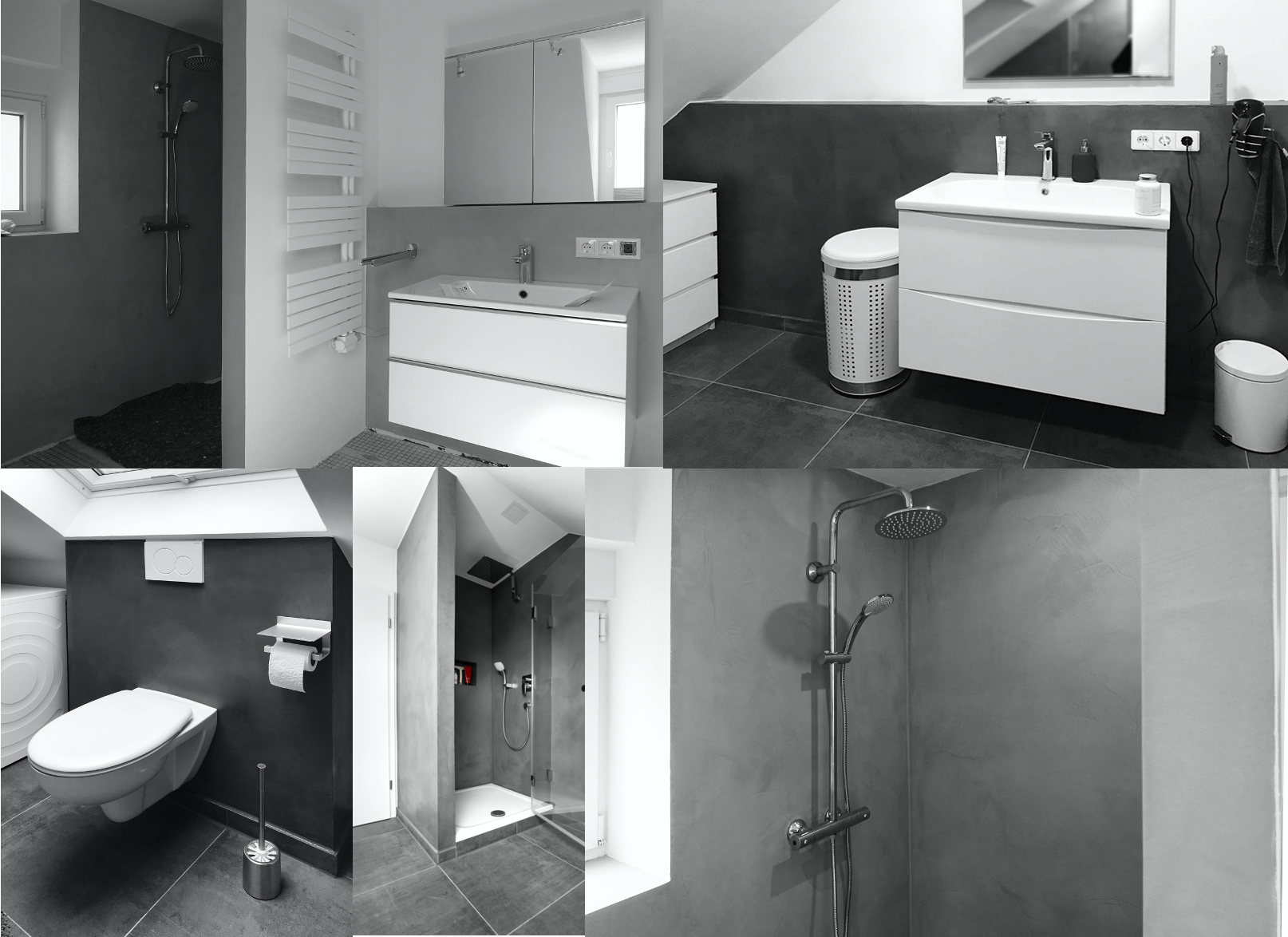 Durch die glatten Oberflächen wirkt das Bad wohnlich und in Kombination mit mineralischen Putzen ergibt sich zusätzlich eine natürliche Feuchteregulierung. Aufgrund der geringen Schichtdicke eignet sich diese Technik sehr gut zur Renovierung, da die Aufbringung auf die verschiedensten Untergründe erfolgen kann.